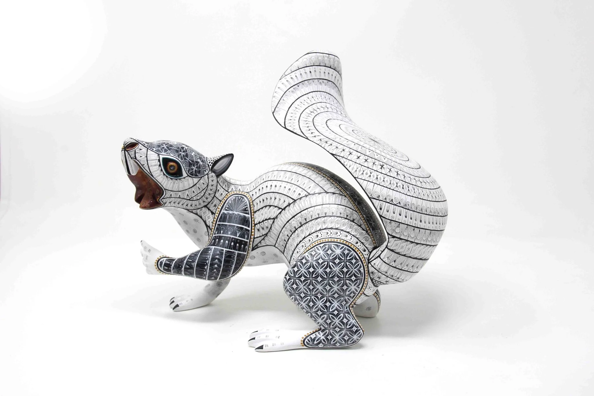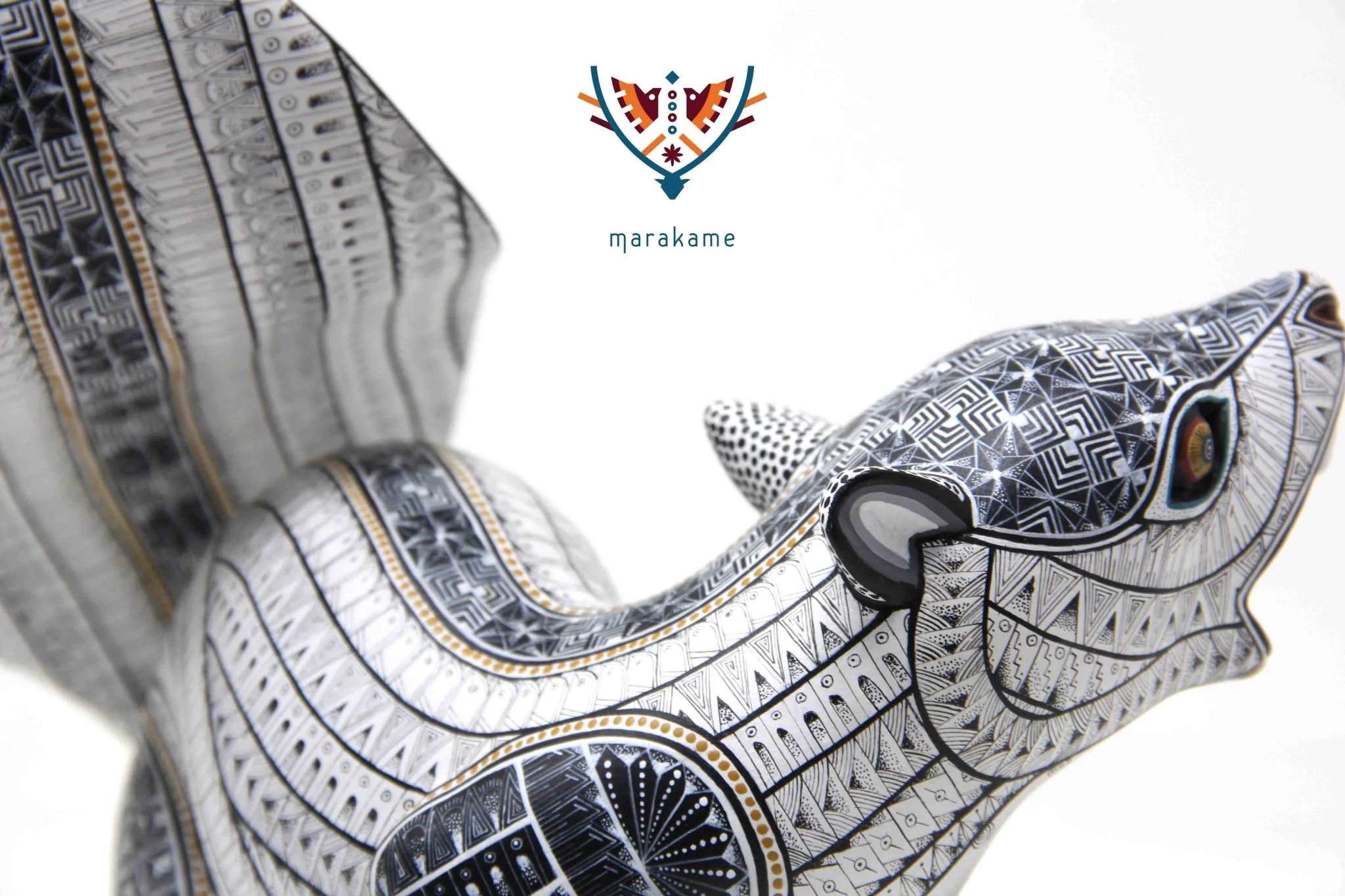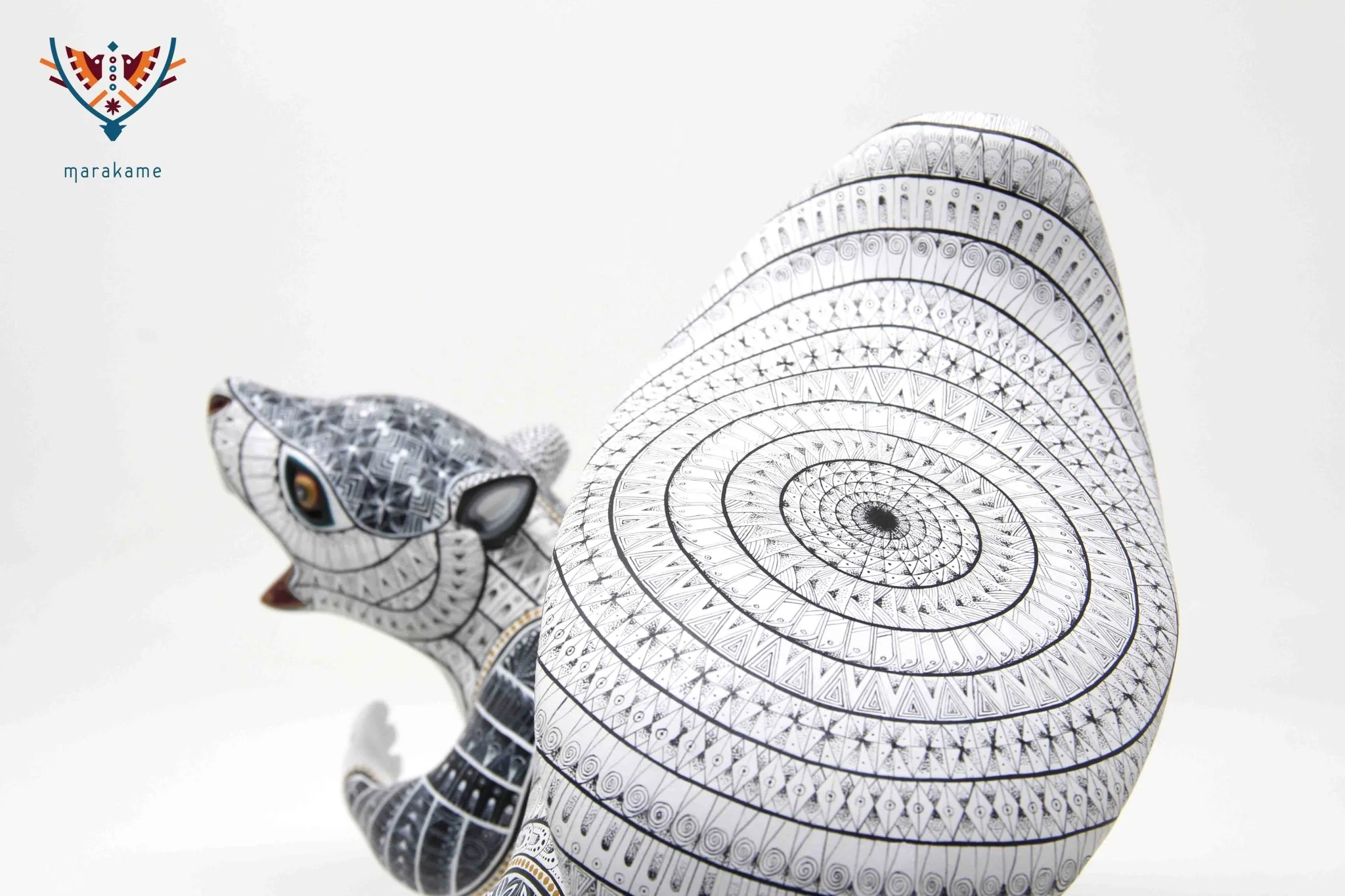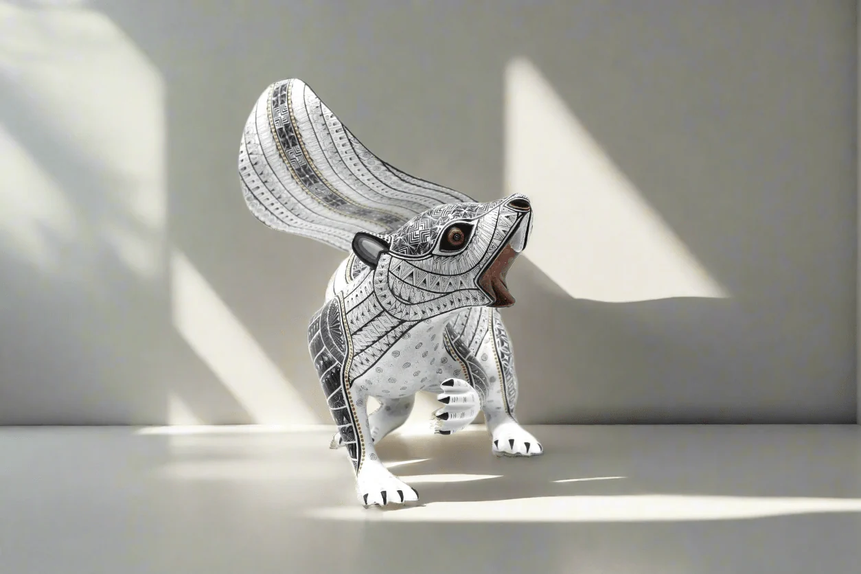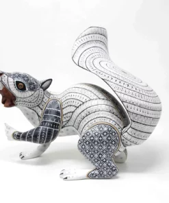 Este Alebrije Ardilla es una pieza artística que combina la tradición de los alebrijes mexicanos con el simbolismo zapoteca. El alebrije está diseñado en pose dinámica, como si estuviera listo para saltar o correr.