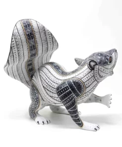Los colores predominantemente blancos del alebrije crean un efecto visual claro y brillante, mientras que los detalles en negro de los símbolos zapotecos agregan profundidad y complejidad. Las partes de las patas y la franja en la parte superior de la espalda están pintadas en negro, lo que les da un toque de contraste interesante con el fondo blanco.
