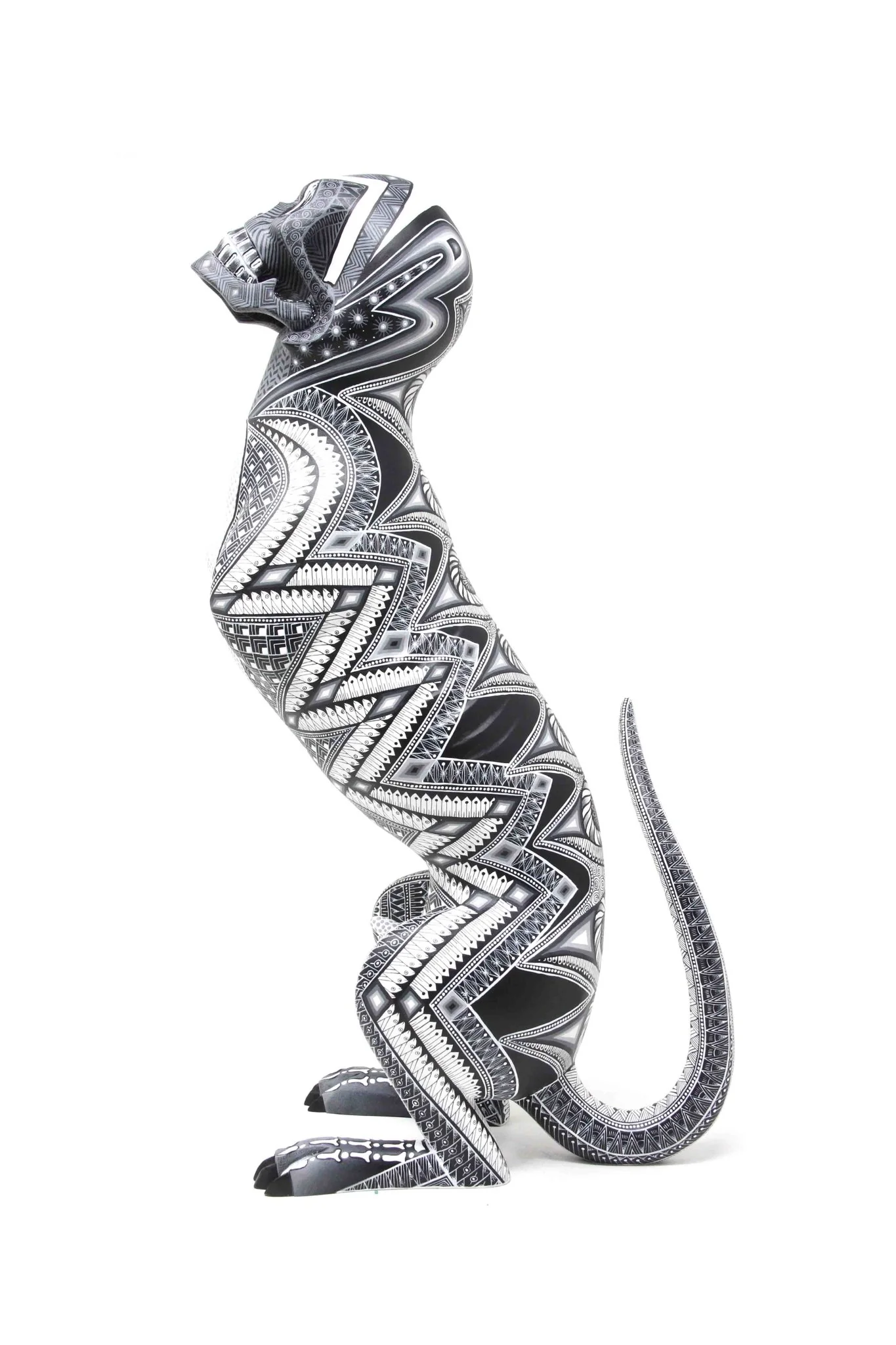 En el plano terrenal perro consagrado fiel, amigo y acompañante del hombre, entre vivos y muertos – Xoloitzcuintle – quien huyó y se escondió entre los maizales cuando el sol y la luna recién aparecieron en el cielo, comparte el camino continuo en la búsqueda del eterno reposo de tu alma y en el descenso al inframundo, quien aquel viajero afable, en tu viaje – Orejas – afluente a la orilla del río te espera para cruzar las caudalosas corrientes, dejando atrás a los deambulantes diáfanos que se combinan con el viento junto con el señor del ocaso, sin jamás siquiera iniciar su viaje.Amos afables de Xoloitzcuintles, Jacobo y María Angeles que parten de una tradición antigua y del vínculo con estos seres superlativos, comparten un conjunto de esculturas que dotan de lomos, trompas y orejas bien definidas, contemplando la subjetividad del arte en cada línea y trazo en blanco y negro, al final de color parduzco, no siendo casualidad atar su cuello en kilates y perfilar imponentes posturas del ser antiguo – ser imperial – Eterno Reposo confín remoto a la ofrenda a estos seres de inteligencia y personalidad magnífica que comparten el camino continuo para salvar tu alma en el mundo espiritual, terrenal y en el inframundo.