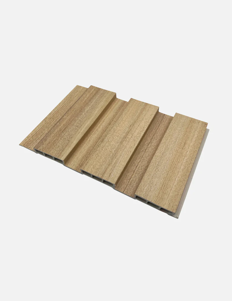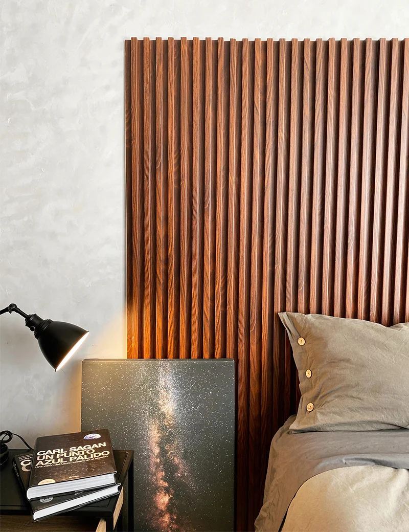 Lambrín Interior WIDE Color Encino. El panel WPC para interiores está compuesto por un 60% de resina de madera y un 40% de PVC, y está acabado con un revestimiento de impresión texturizado que le confiere el aspecto de la madera.