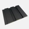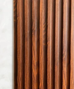 Lambrín Interior WIDE Color Parota fondo negro. El panel WPC para interiores está compuesto por un 60% de resina de madera y un 40% de PVC, y está acabado con un revestimiento de impresión texturizado que le confiere el aspecto de la madera.