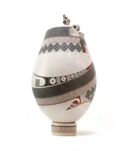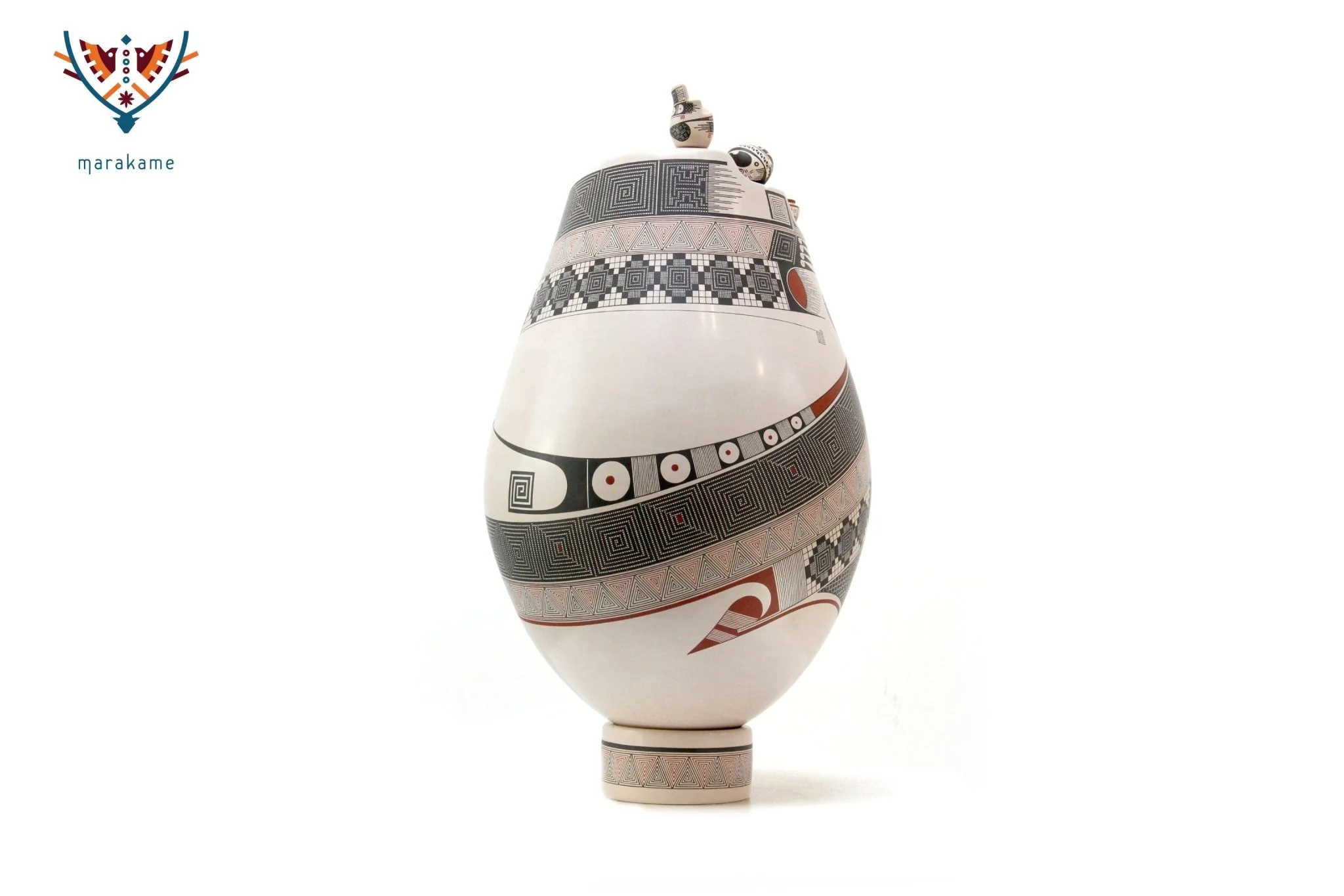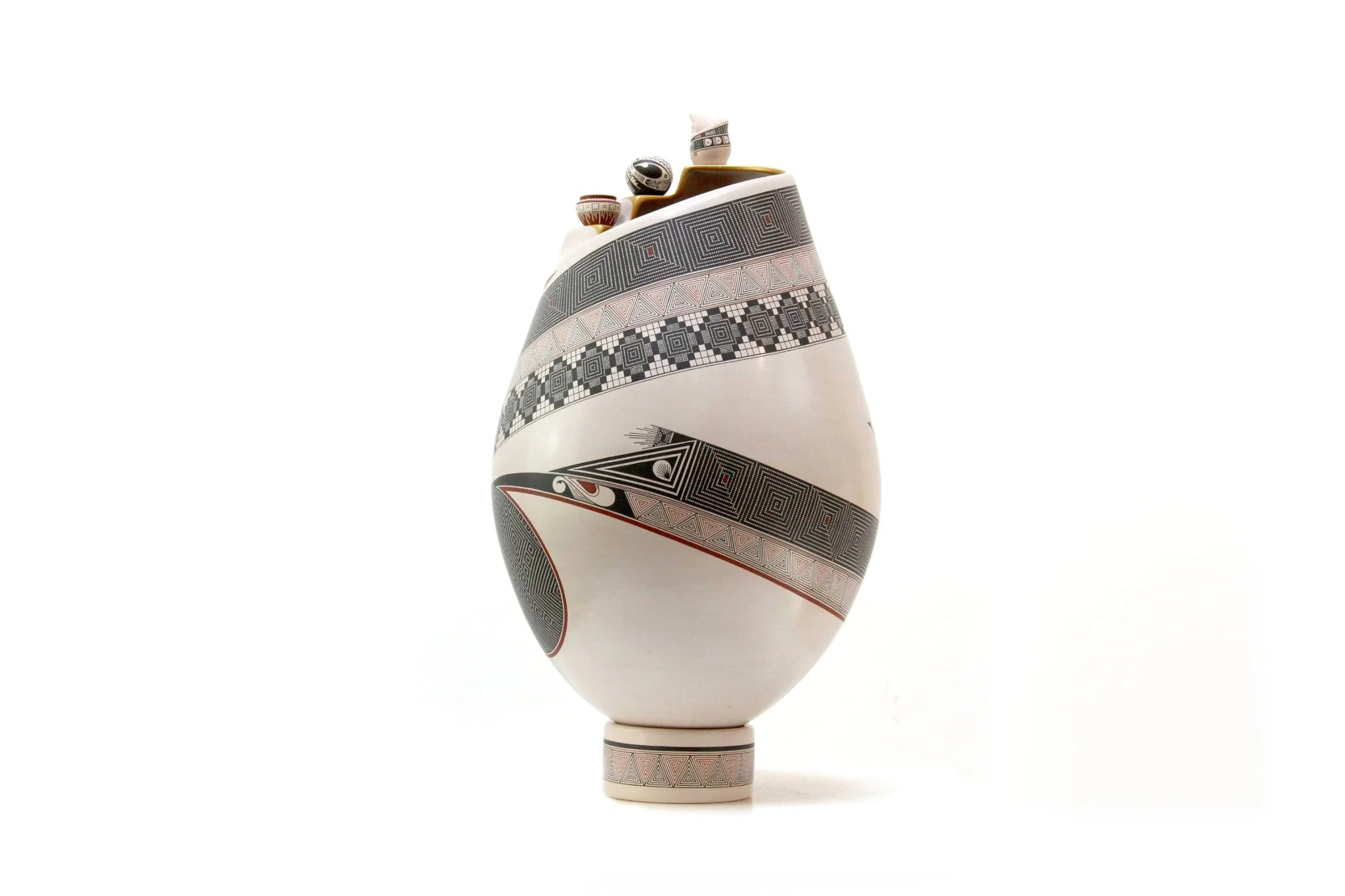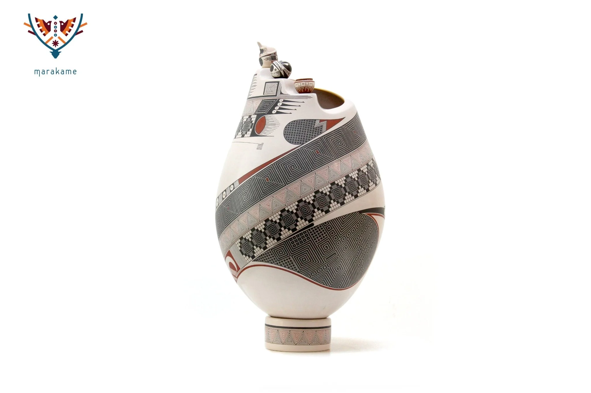 Esta impresionante pieza de cerámica es un verdadero trabajo de arte, con un diseño único y llamativo que invita a la contemplación. La parte superior de la pieza presenta una escalera elegante y delicada, con curvas suaves y rectas que se entrecruzan en un patrón interesante.