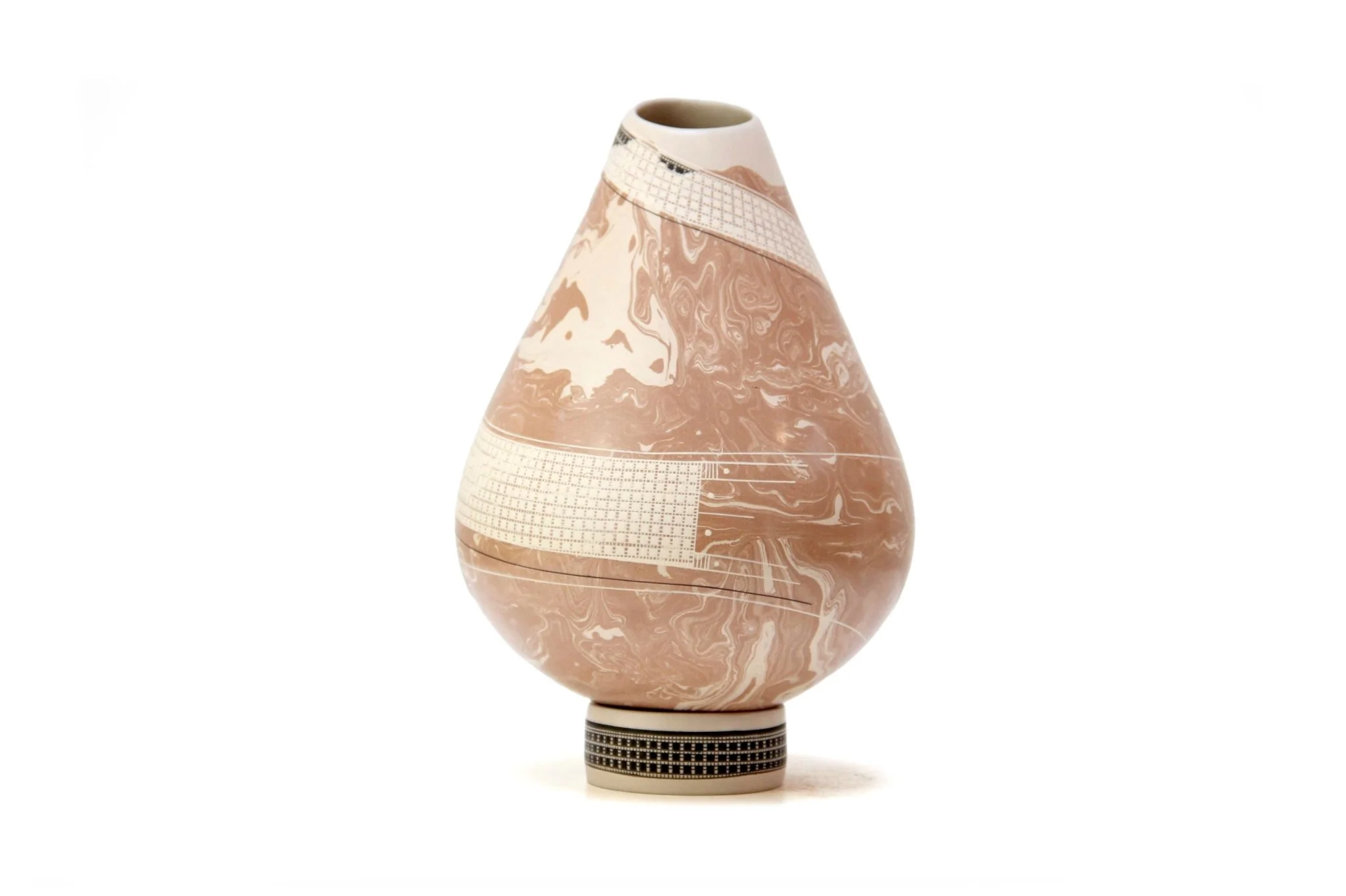 Esta impresionante pieza de cerámica presenta un diseño único y llamativo, con un tono naranja sobrio que invita a la contemplación. La textura de la cerámica es lo más destacado de esta pieza, ya que parece como si líquidos estuvieran mezclándose en una compleja danza visual.