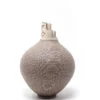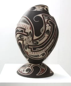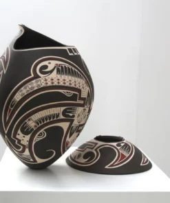 En este trabajo de cerámica, el artista ha creado un diseño sombrío y misterioso con una especie de cruz central con movimiento pintada en blanco sobre un fondo oscuro. La textura oscura de la cerámica proporciona un contraste interesante con los detalles blancos, creando una sensación de profundidad y dimensión.