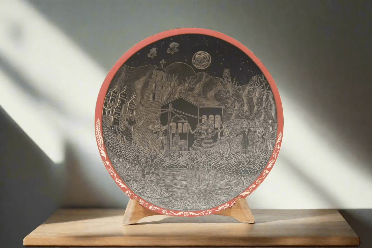 En esta pieza de cerámica de Mata Ortiz, se representa el Día de Muertos, una de las tradiciones más importantes de México, donde se honra a nuestros ancestros. En este caso, se honra a los primeros ceramistas, que sentaron la base para las siguientes generaciones en Chihuahua.