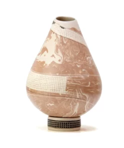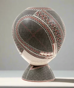 Un verdadero trabajo de arte, esta cerámica grande destaca por sus detalles geométricos en negro que se combinan con complementos rojos en un diseño que es a la vez rico y equilibrado. La cerámica grande presenta detalles geométricos en negro que cubren su superficie, creando un efecto visual rico y texturizado.