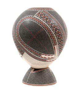 La escala grande de la pieza permite apreciar los detalles geométricos y los complementos en rojo de manera aún más detallada, creando un efecto visual que es difícil de olvidar. Esta obra de arte cerámica es un verdadero tesoro para cualquier coleccionista, una pieza única y especial que puede ser disfrutada por aquellos que aprecian el arte y la cerámica.