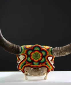 – El cráneo ha sido fumigado y barnizado para su exportación en caso de ser requerida.Piezas como los cráneos de ganado son producto de alguna celebración tradicional Wixárika -Huichol- y son posibles gracias al pegado de más de 33 mil chaquiras de cristal calibrado, una a una por las manos de los artistas Wixáritari. Cada pieza es única e irrepetible.