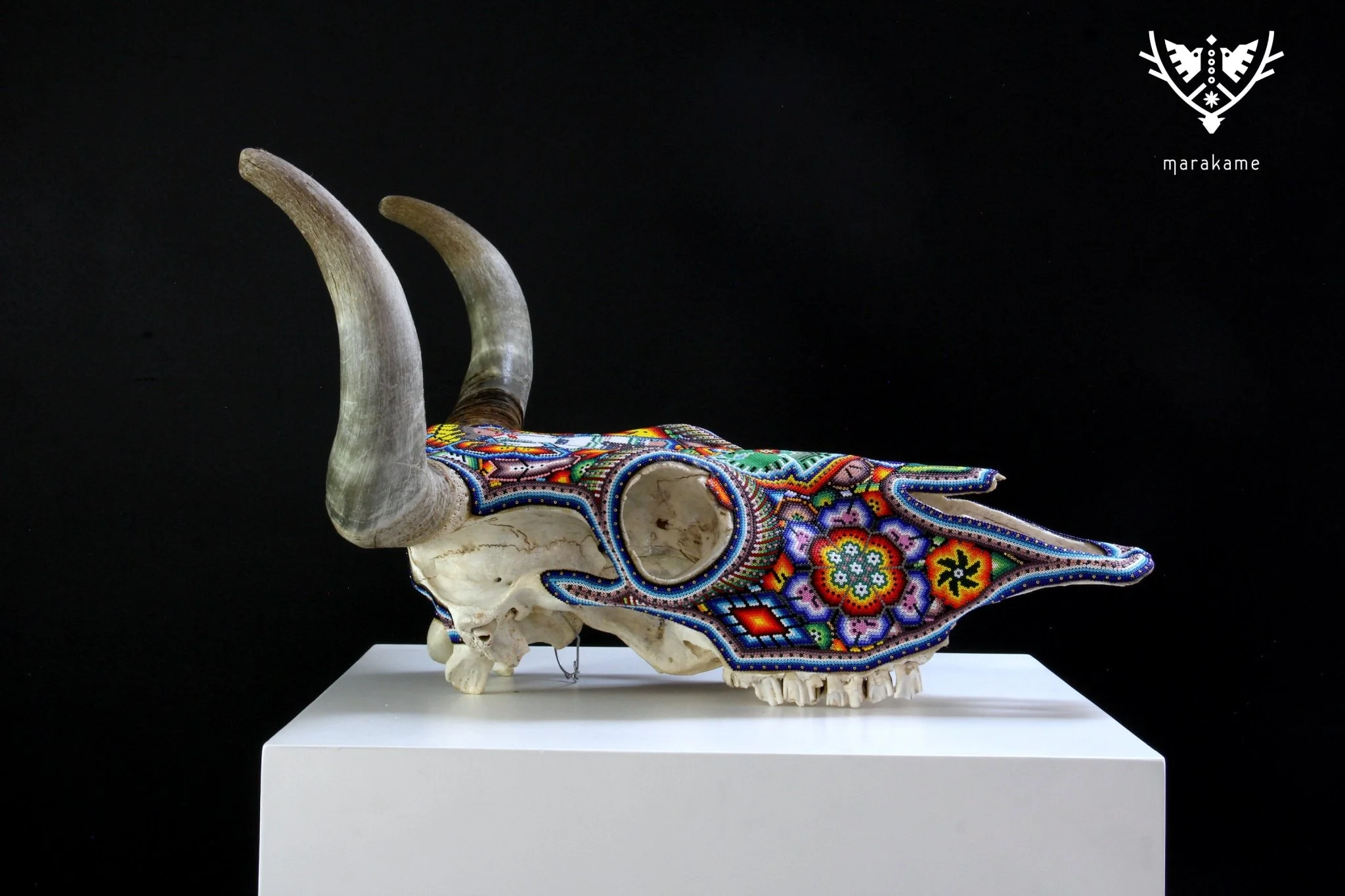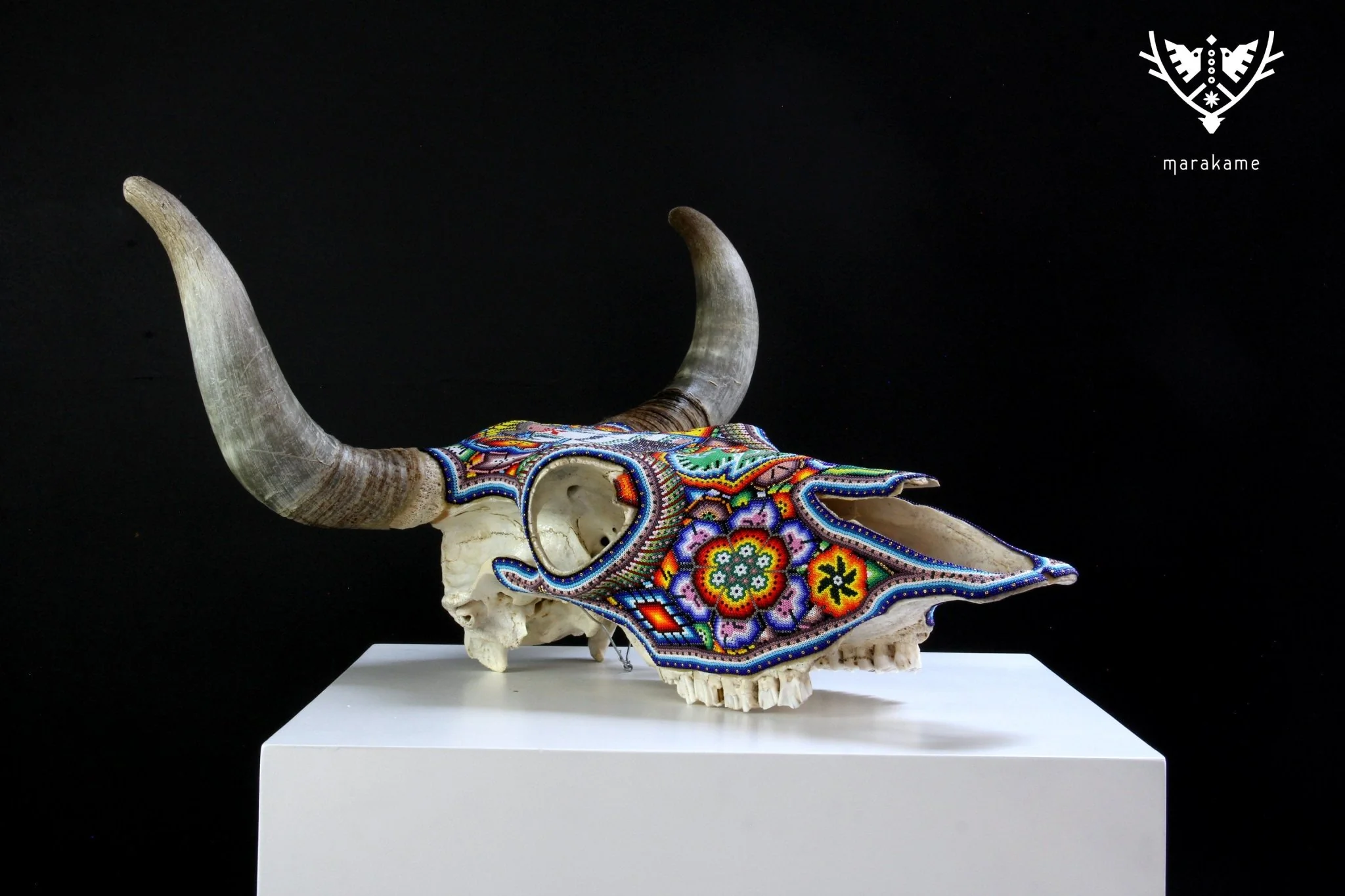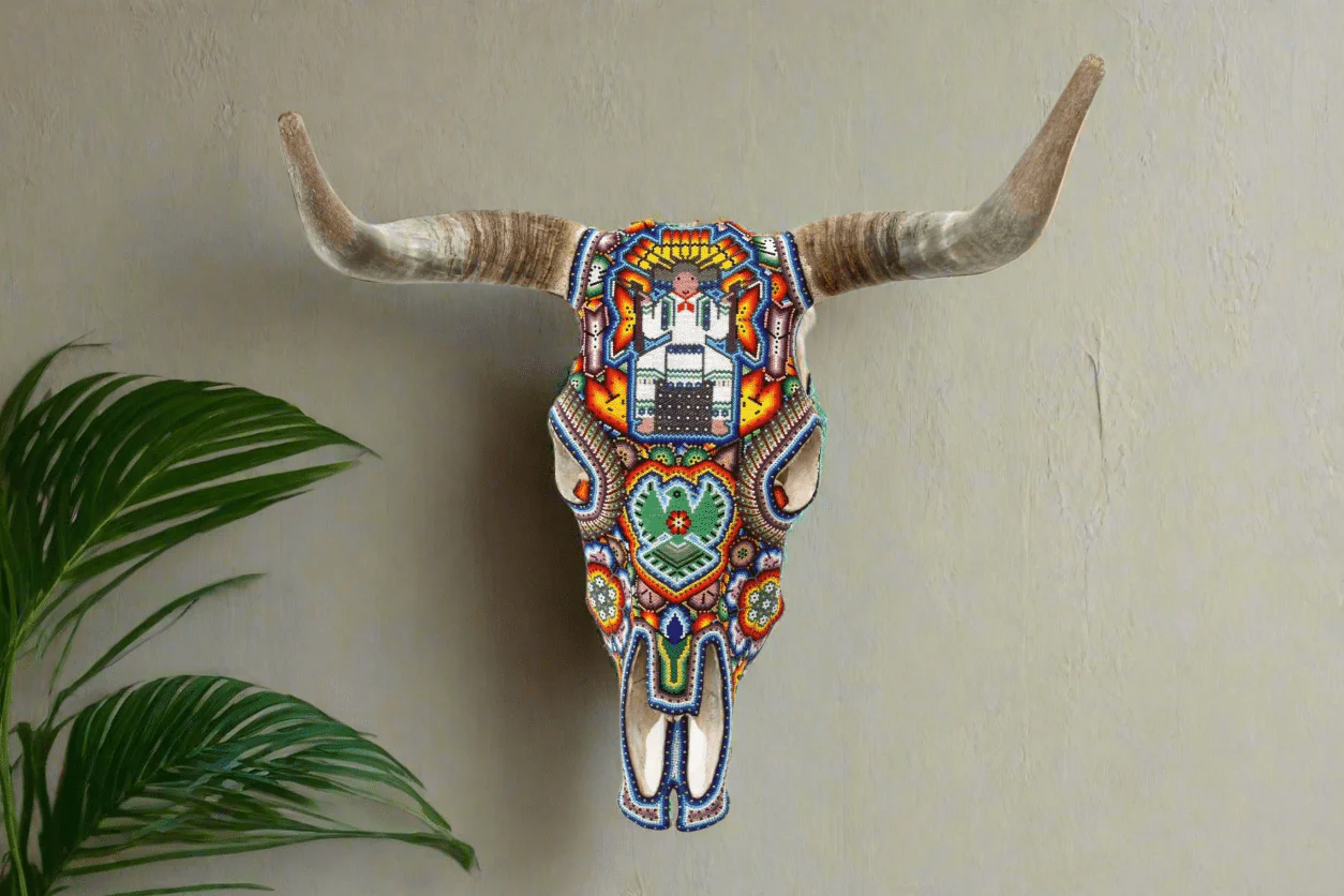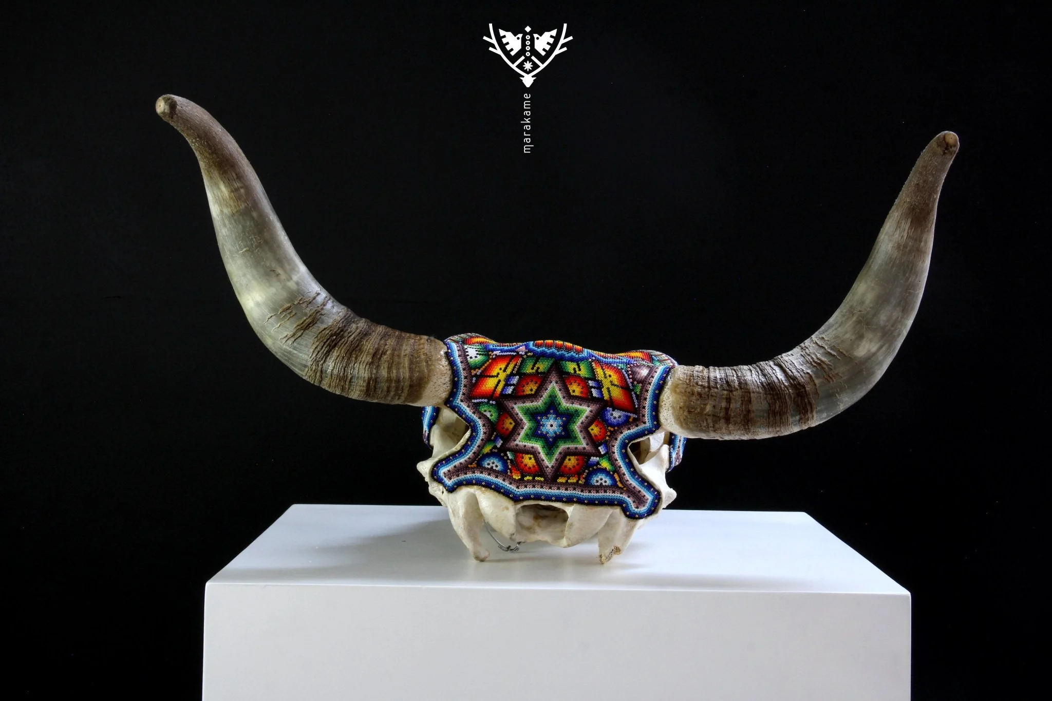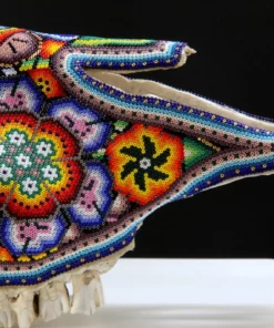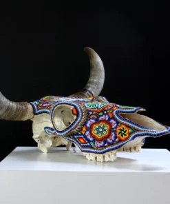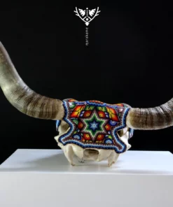 – El cráneo ha sido fumigado y barnizado para su exportación en caso de ser requerida.Piezas como los cráneos de ganado son producto de alguna celebración tradicional Wixárika -Huichol- y son posibles gracias al pegado de más de 33 mil chaquiras de cristal calibrado, una a una por las manos de los artistas Wixáritari. Cada pieza es única e irrepetible.