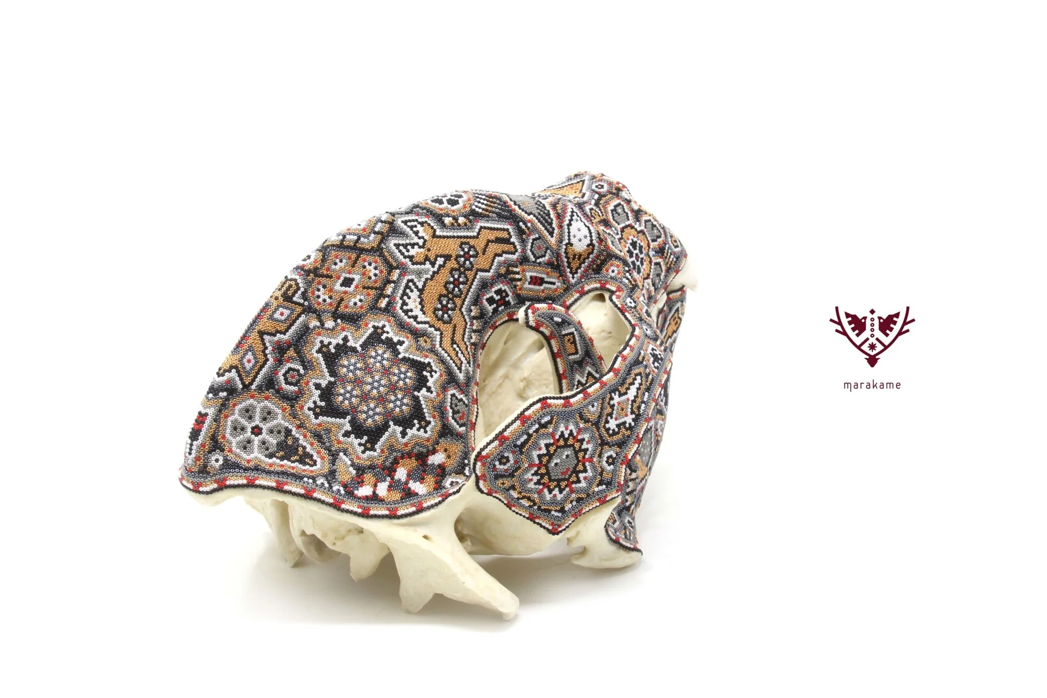 Este cráneo de oso panda es un verdadero tesoro natural, decorado con chaquiras en colores tierra que reflejan la riqueza y la sabiduría de la cultura zapoteca. El cráneo está cubierto de una serie de patrones y diseños vistosos que invitan a la contemplación y evocan el espíritu ancestral y protector de este gran animal. En el centro del cráneo, se encuentra un relieve de una aguja, rodeada por venados y otros símbolos de la cultura zapoteca, creando un efecto visual impresionante que combina la fuerza y la belleza.