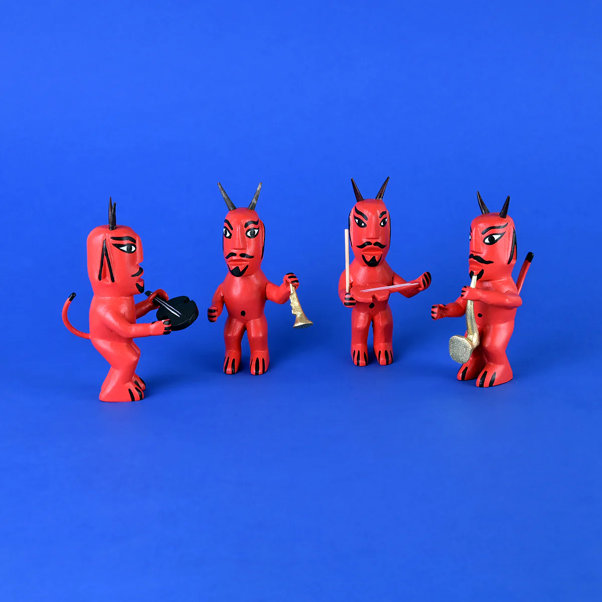Madera tallada, policromada e intervenida con canica de vidrio. Piezas del maestro Gabriel Pérez.