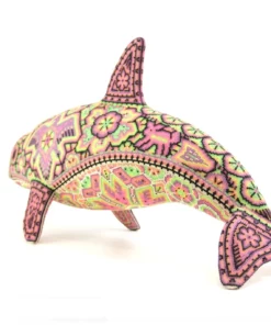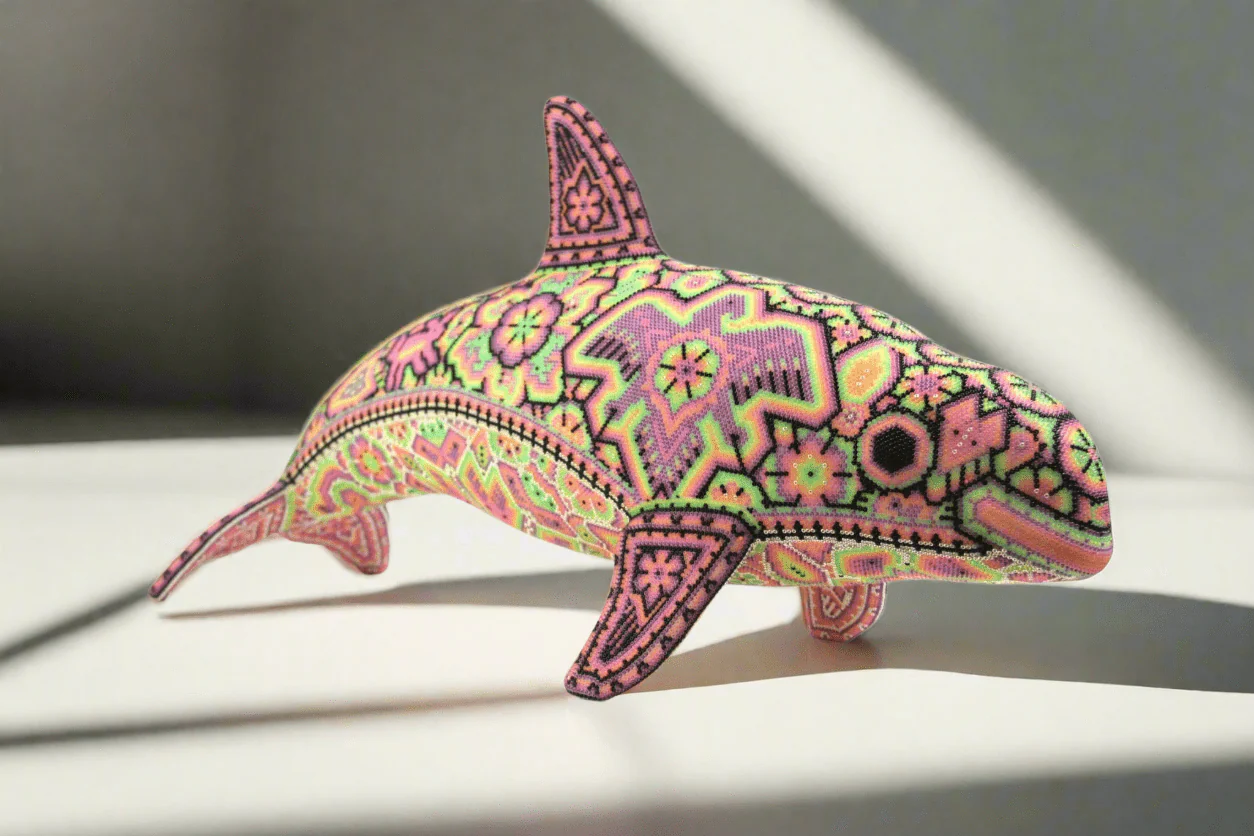 La Vaquita Marina es una obra maestra de arte ceremonial zapoteco, que destaca por su belleza y brillo. La pieza está tallada en madera y adornada con cristales de chaquira de neón que brillan en la oscuridad, creando un efecto visual impresionante.