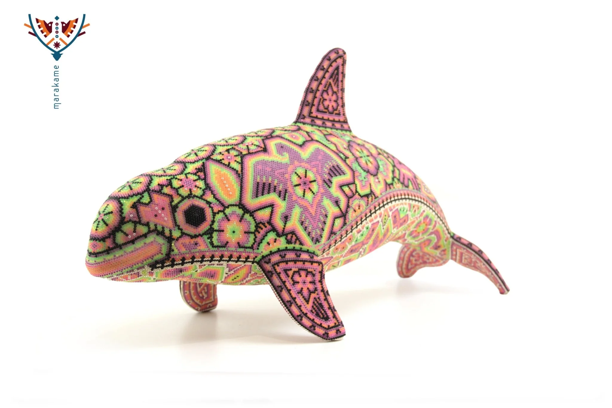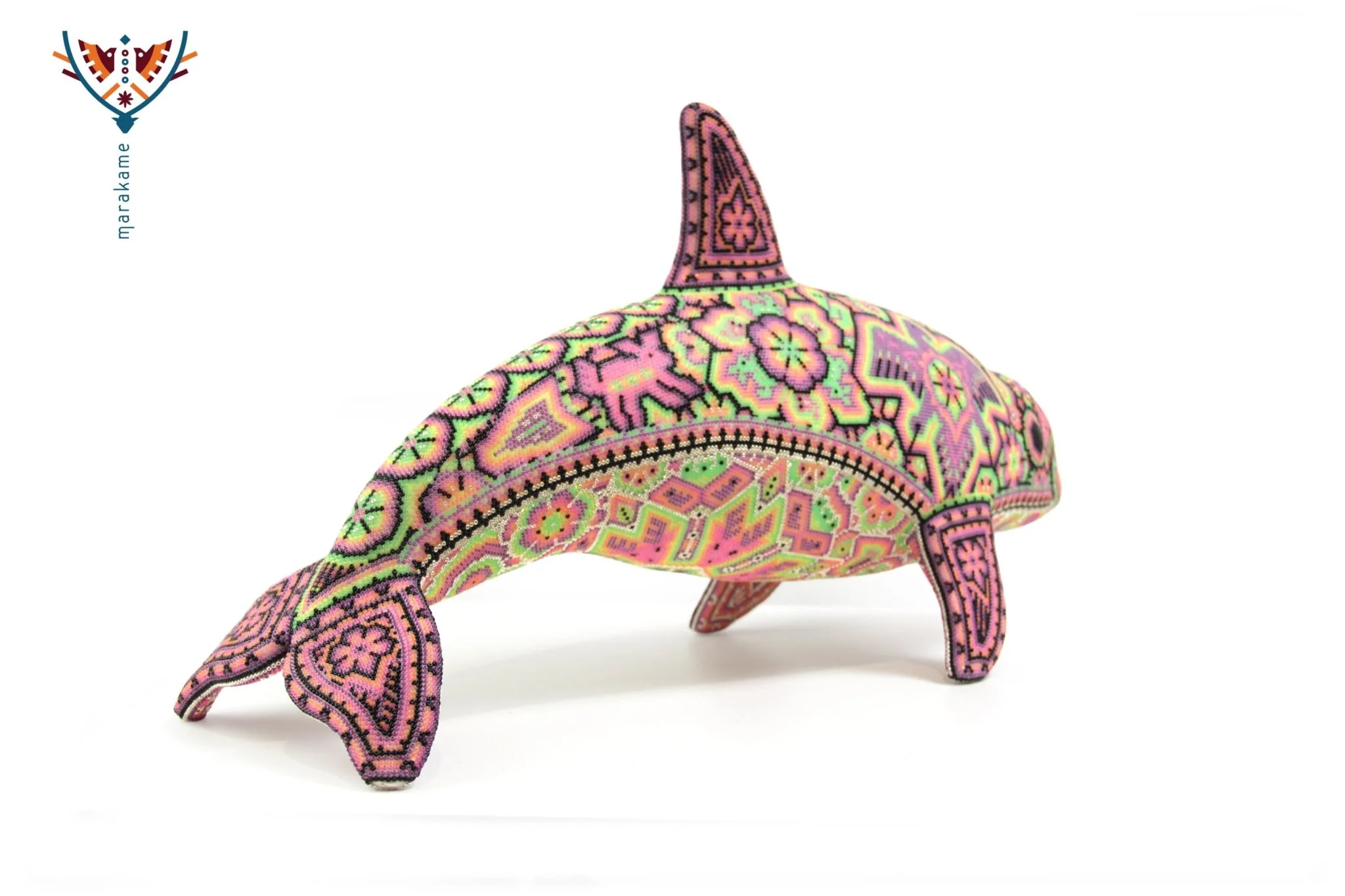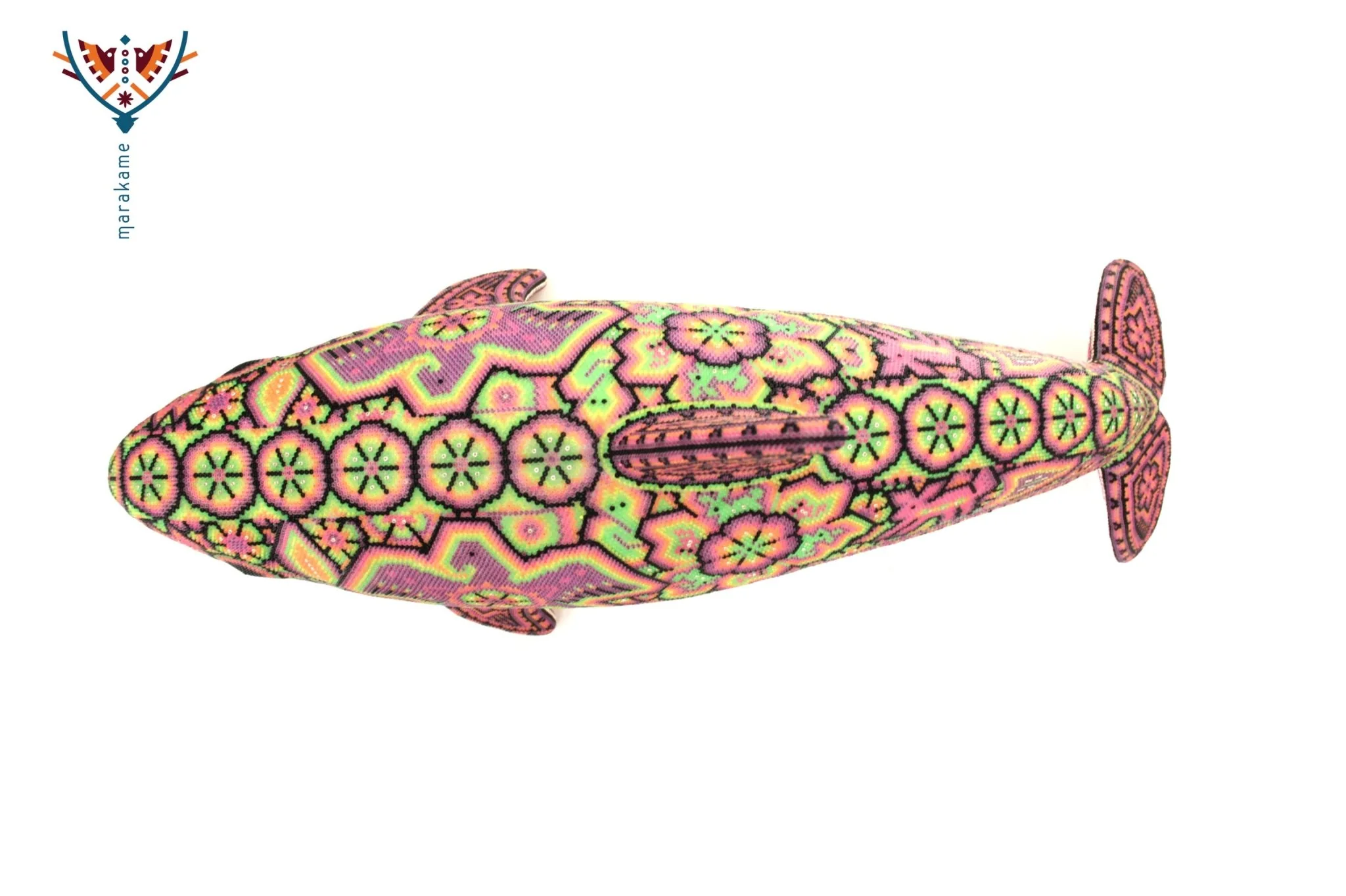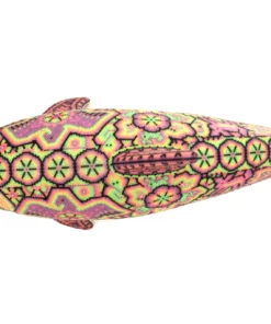 Los colores morados, rosas, verdes y amarillos de los cristales de chaquira se combinan con símbolos como el venado, las figuras felinas y otros símbolos zapotecos, creando una pieza única y exclusiva. La Vaquita Marina es un ejemplo perfecto del arte ceremonial zapoteco, que combina la belleza y la espiritualidad.