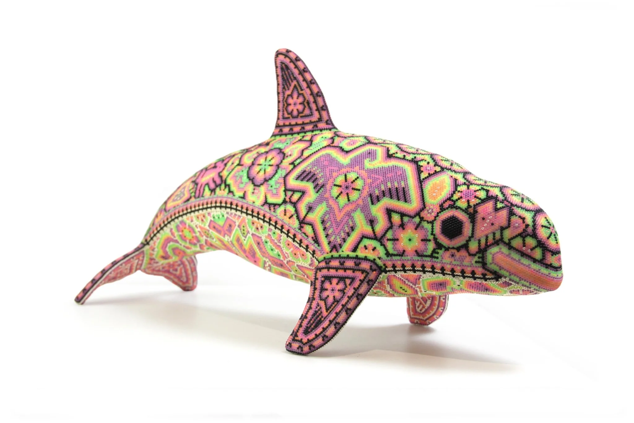 Esta escultura elaborada en arte wixárika (huichol) tradicional tiene en ella más de 45 mil cristales checoslovacos.