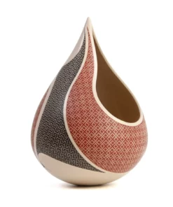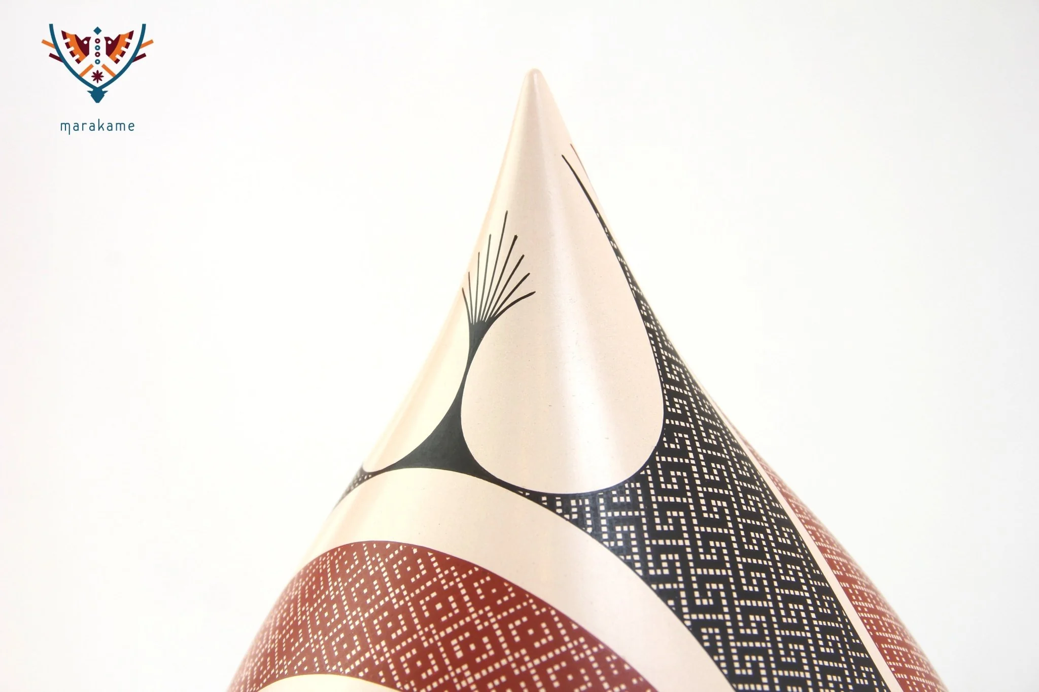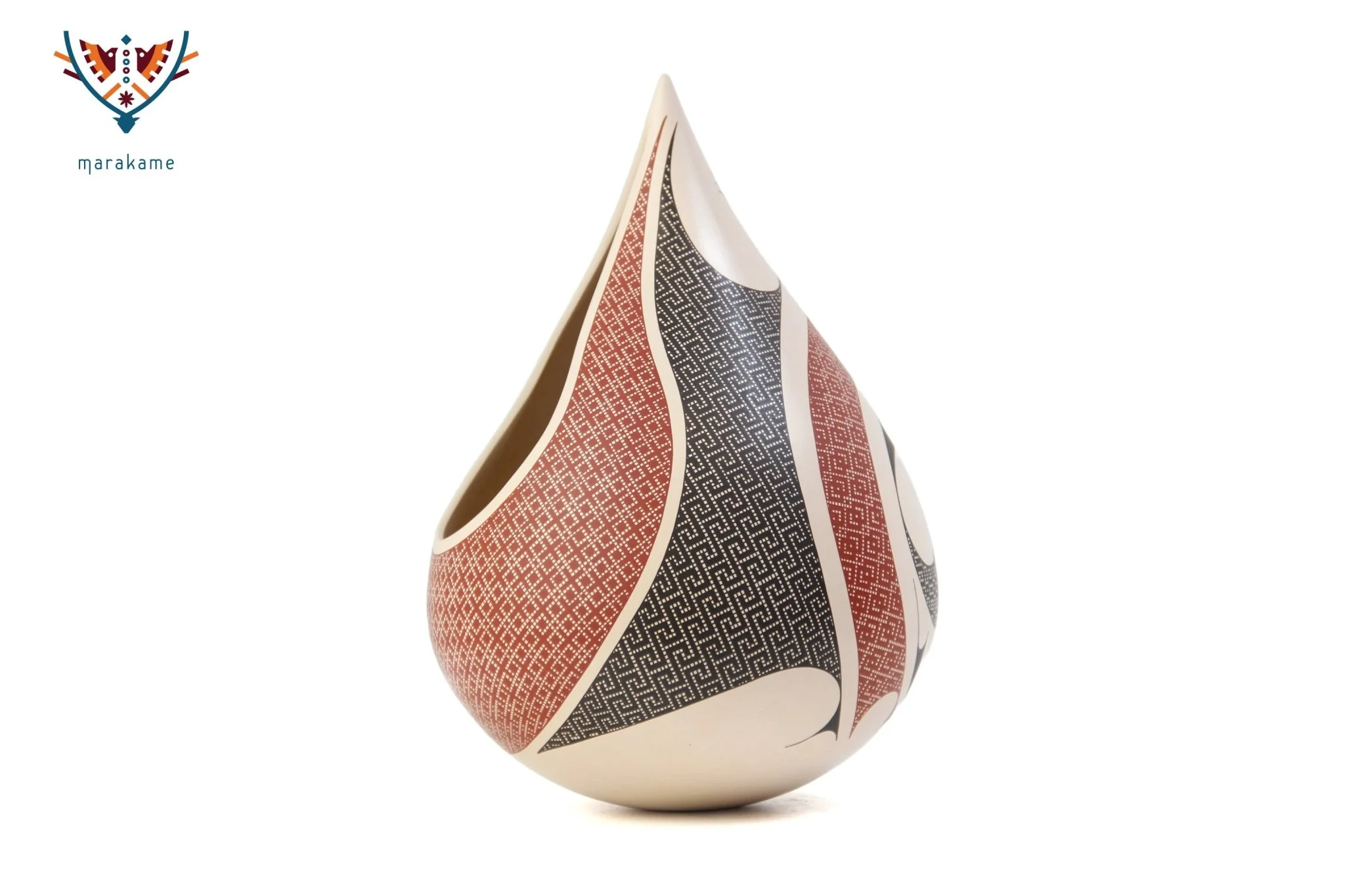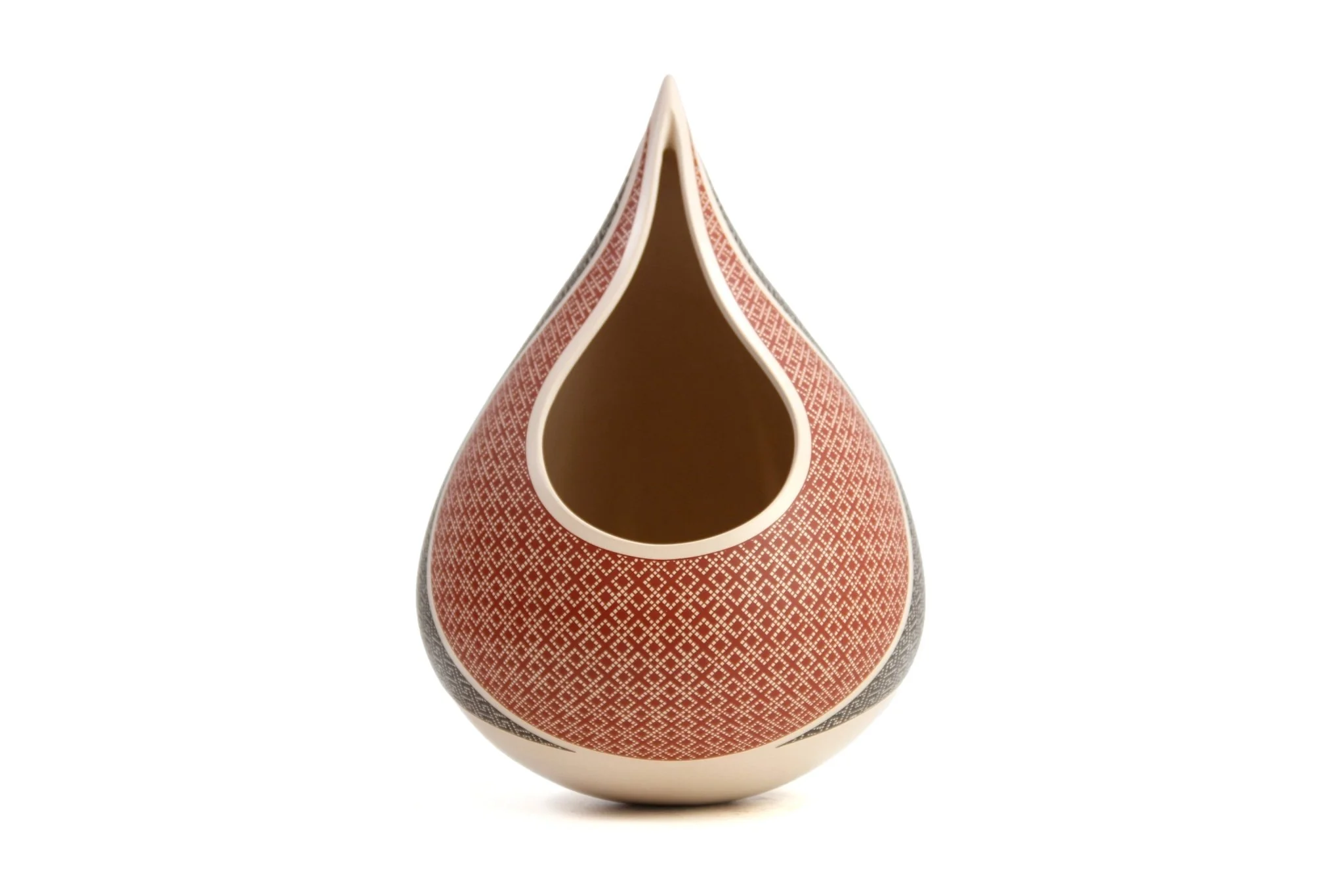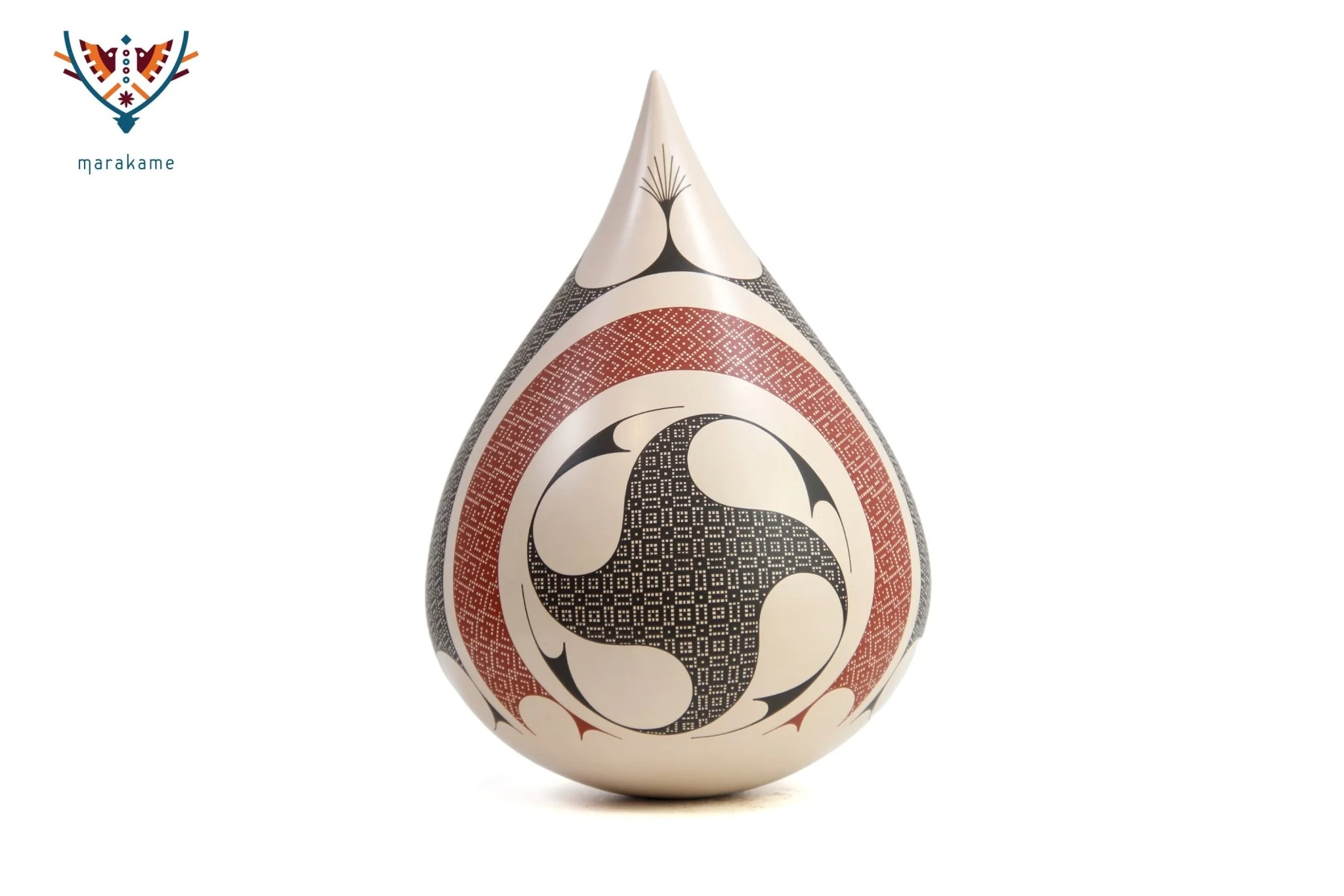La composición vertical de esta pieza genera su movimiento y su equilibrio. La forma exterior es replicada en la boca de la olla, manteniendo un diseño a la vez regular y dinámico. La lluvia es una bendición, cada gota permite el desarrollo de la vida, su crecimiento. El agua también es esencial para el trabajo alfarero. Esta gota trae consigo maravillas.
