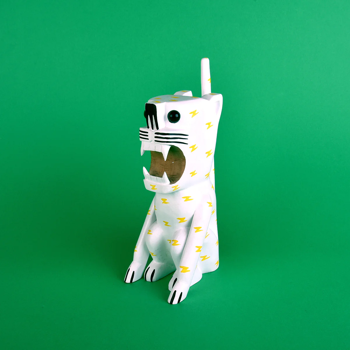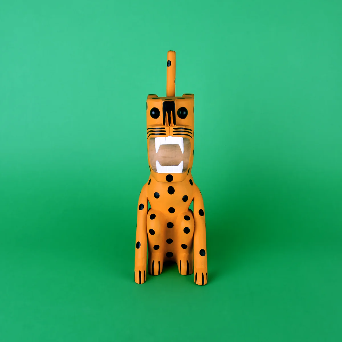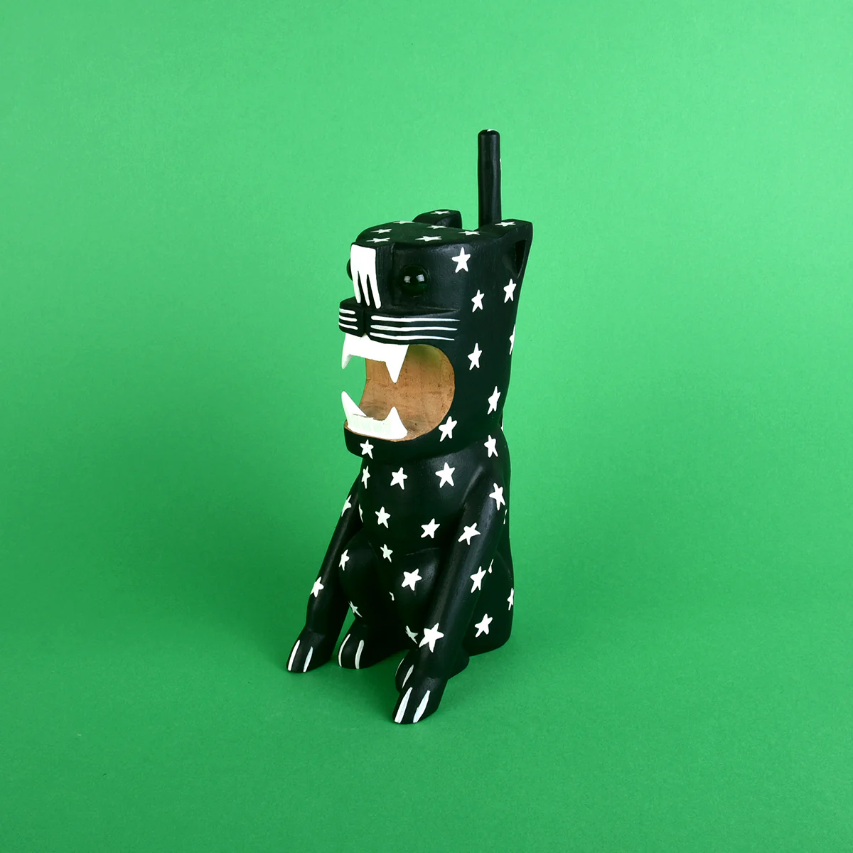 Madera tallada, policromada e intervenida con canica de vidrio. Piezas del maestro Gabriel Pérez.