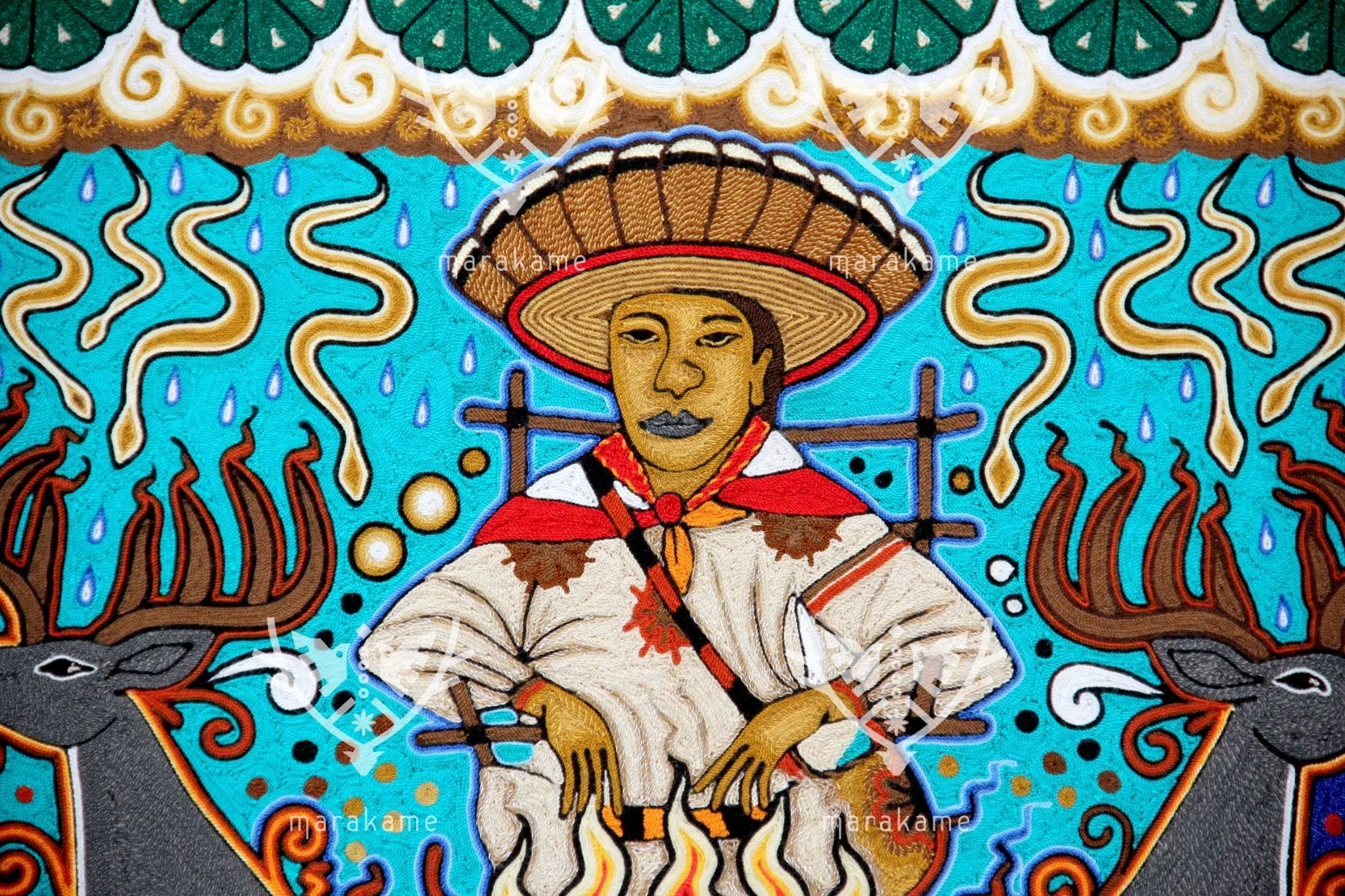 Las obras utilizan una variante de hilo distinta al resto de los cuadros de estambre, lo que permite a los artistas emplear una gama cromática más amplia, aportando carácter y atmósfera a las complicadas escenas y composiciones, ya sea en formatos redondos o rectangulares.En el centro del cuadro, un huchol sentado en un círculo nos invita a entrar en su mundo espiritual. Debajo de él, un caldero de fuego arde, simbolizando la energía y la sabiduría. A los lados del caldero, dos venados majestuosos se encuentran en quietud, representando la conexión con la naturaleza. En la parte superior e inferior del cuadro, simbolos del peyote nos recuerdan la importancia de la conexión con la naturaleza y el espíritu.