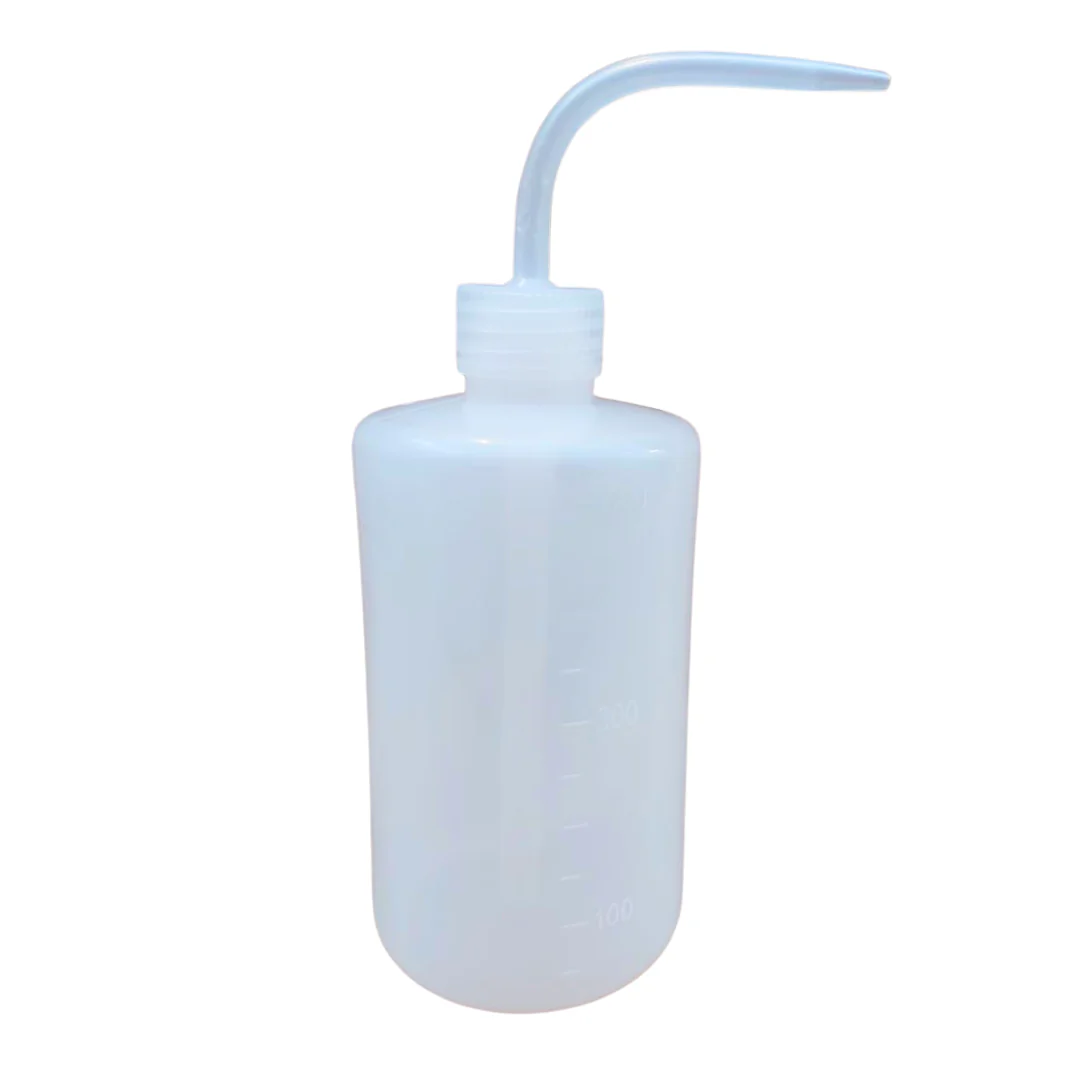 Frasco de plástico flexible con manguera para regar de forma contralada plantas en macetas pequeñas.